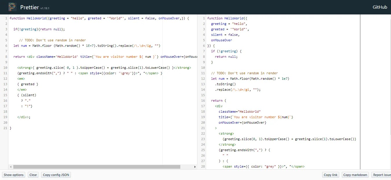Prettier is a code formatter with support for JavaScript, including ES2017, JSX, Angular, Vue, Flow, TypeScript, and more. It removes your original styling and replaces it with standard consistent styling adhering to the best practices. This handy tool has been very popular in our IDEs, but it also has an online version — a playground where you can prettify your code.